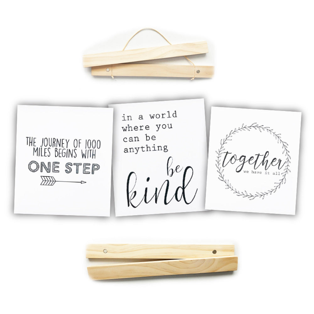 Lightweight, durable, and trendy. Comes with 3 printed canvas pieces that can easily be changed using our Magnetic Click Stick system. Magnetic Click Sticks hold your printing, canvas, or other medium magnetically between two sticks to hang on your wall.