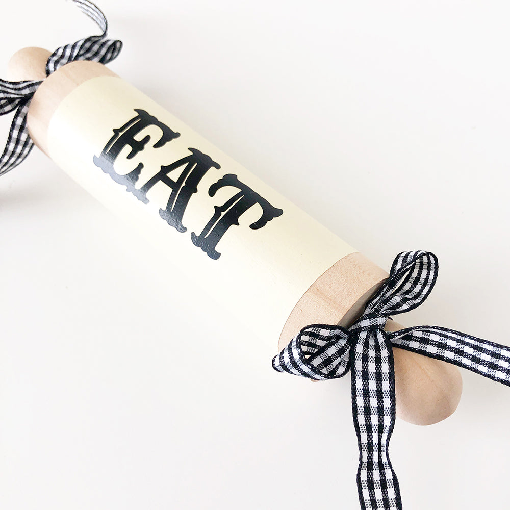 Comes with ribbon as shown and painted with the phrase "EAT".