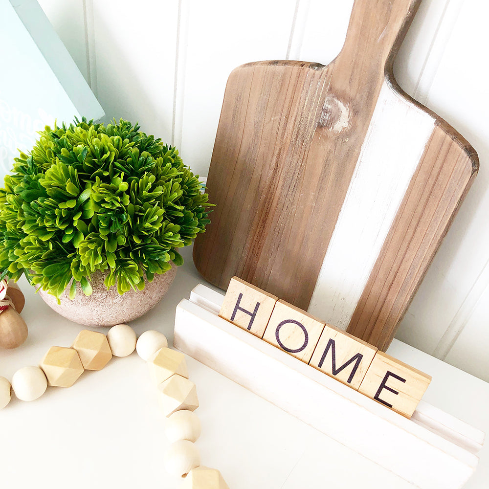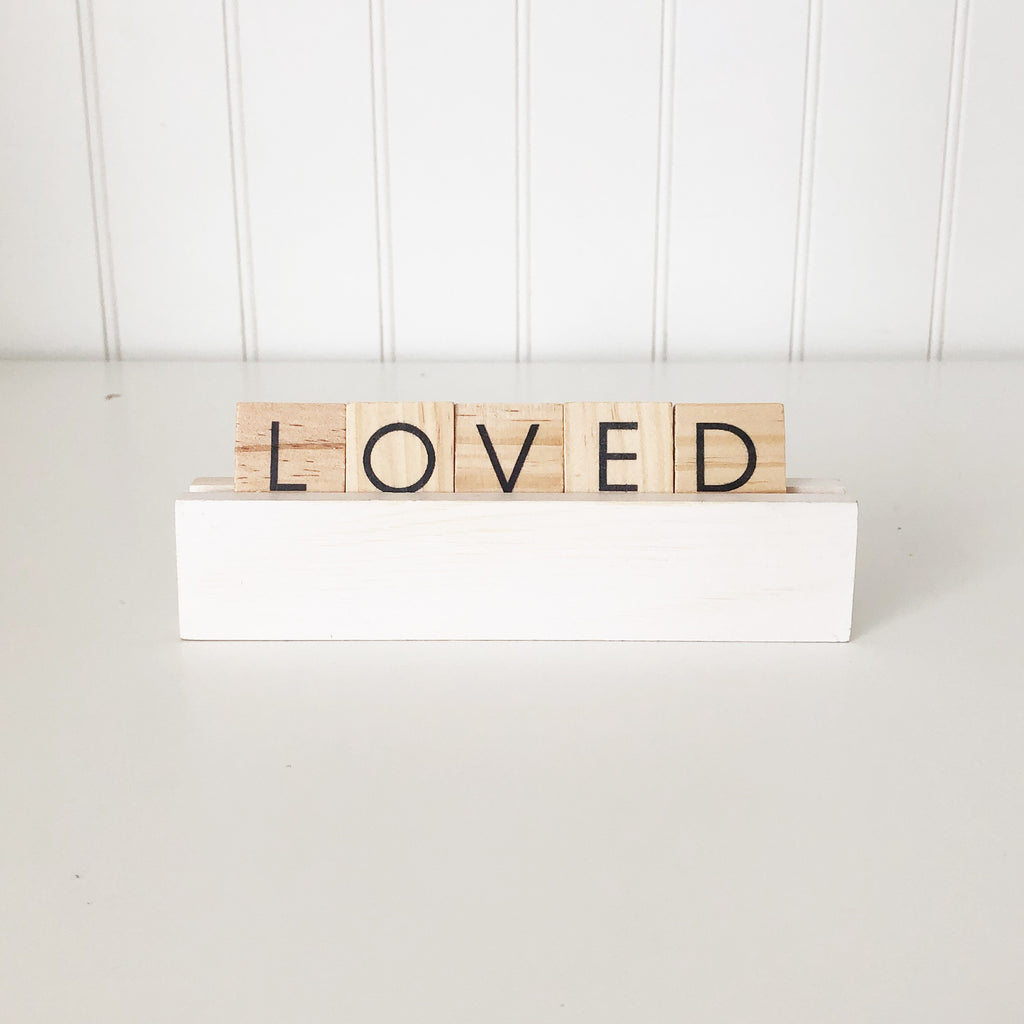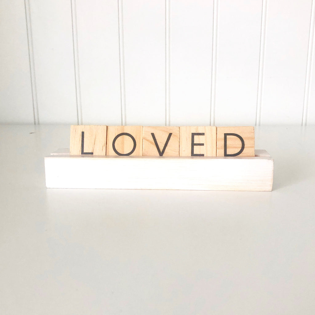 Comes with double sided tiles that spell "LOVED" and "HELLO"