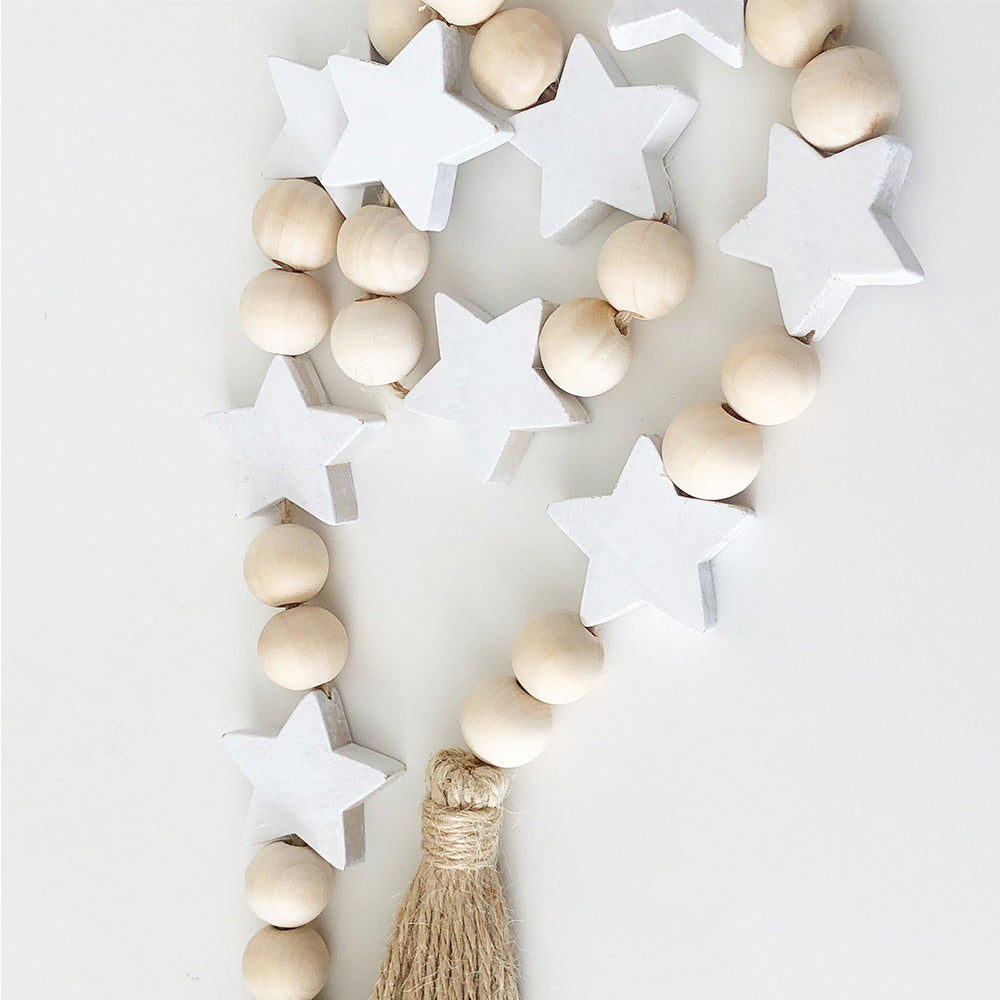3/4 inch beautiful wood beads and white stars! The total strand length is 38-39 inches.