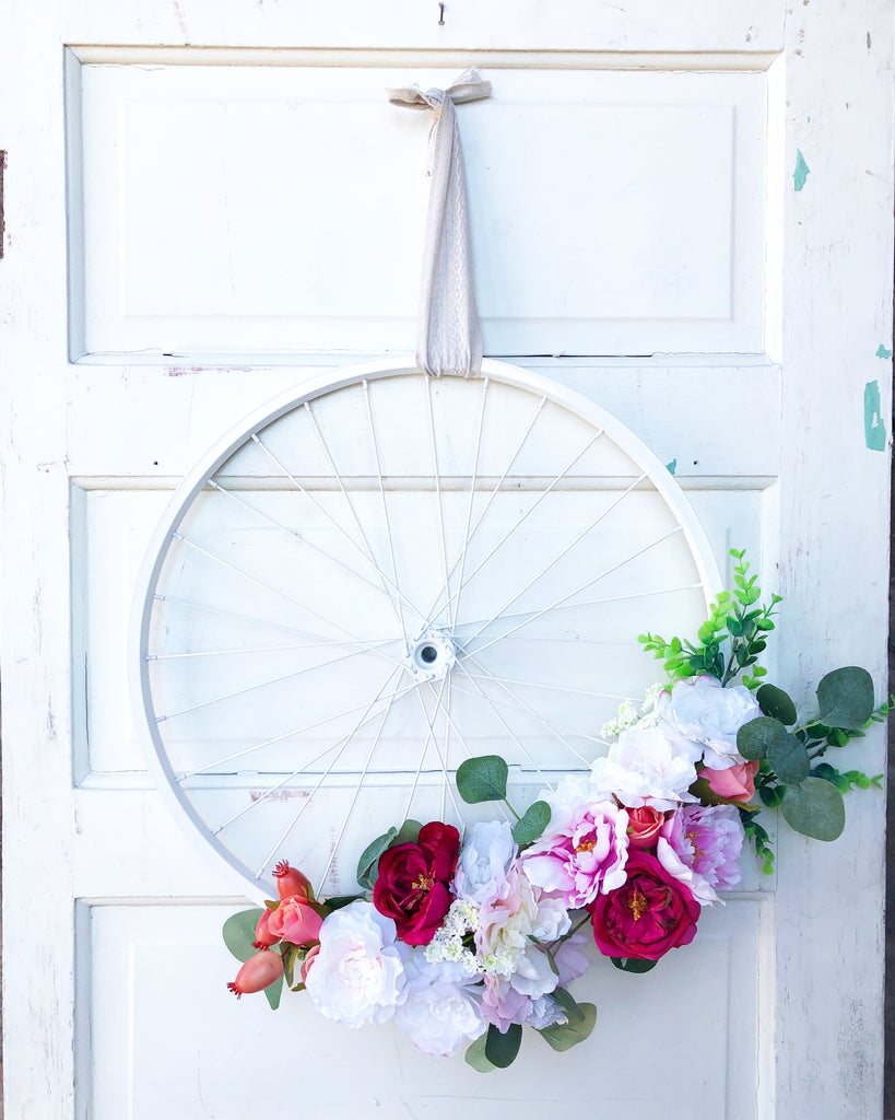 Stunning wreath made from a white bicycle wheel. Large enough to look fantastic on any door or wall.