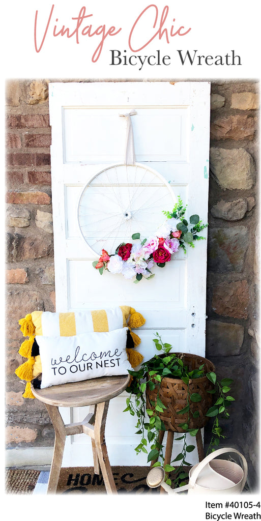 With the base of a 20" bicycle wheel, the festive flower bouquet is attached to look like flowers growing through a bicycle wheel.